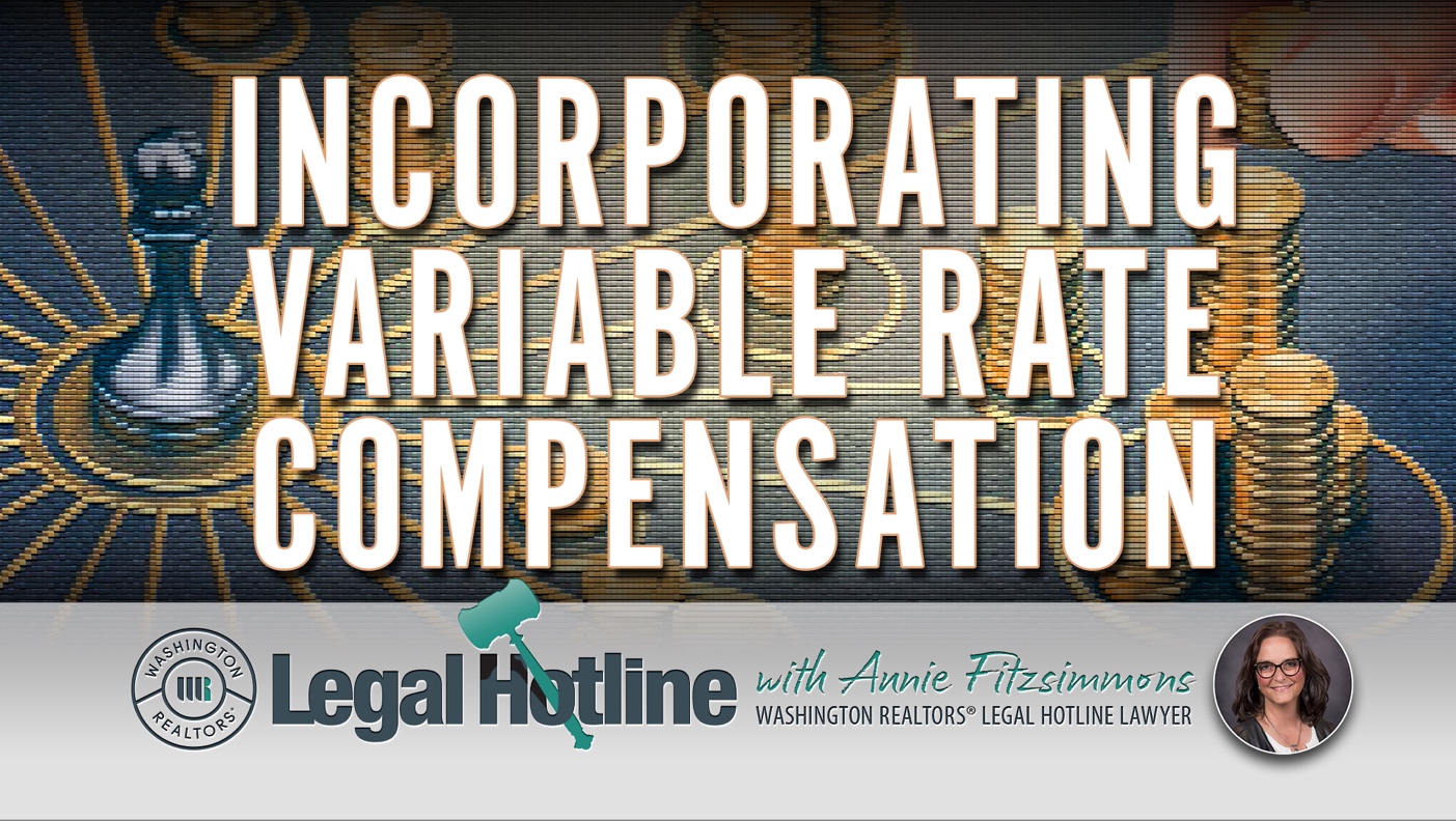 It’s Friday, Folks! And you know what that means... Washington REALTORS® Legal Hotline Lawyer Annie Fitzsimmons is back with our latest Friday Legal Hotline video! This week, Annie takes a look at variable offers of buyer broker compensation. Keep your sellers from owing more in buyer broker compensation than they are expecting and learn how, as a Listing Broker, you can help keep these offers of compensation in place when your sellers enter into Purchase and Sale Agreements (Form 21) with buyers.